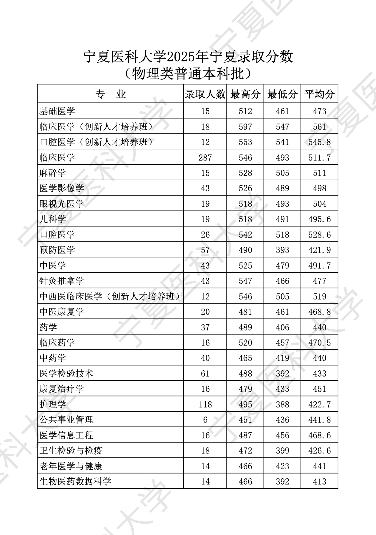 宁夏医科大学2025年普通高考招生录取公告(宁夏-物理类普通本科批)