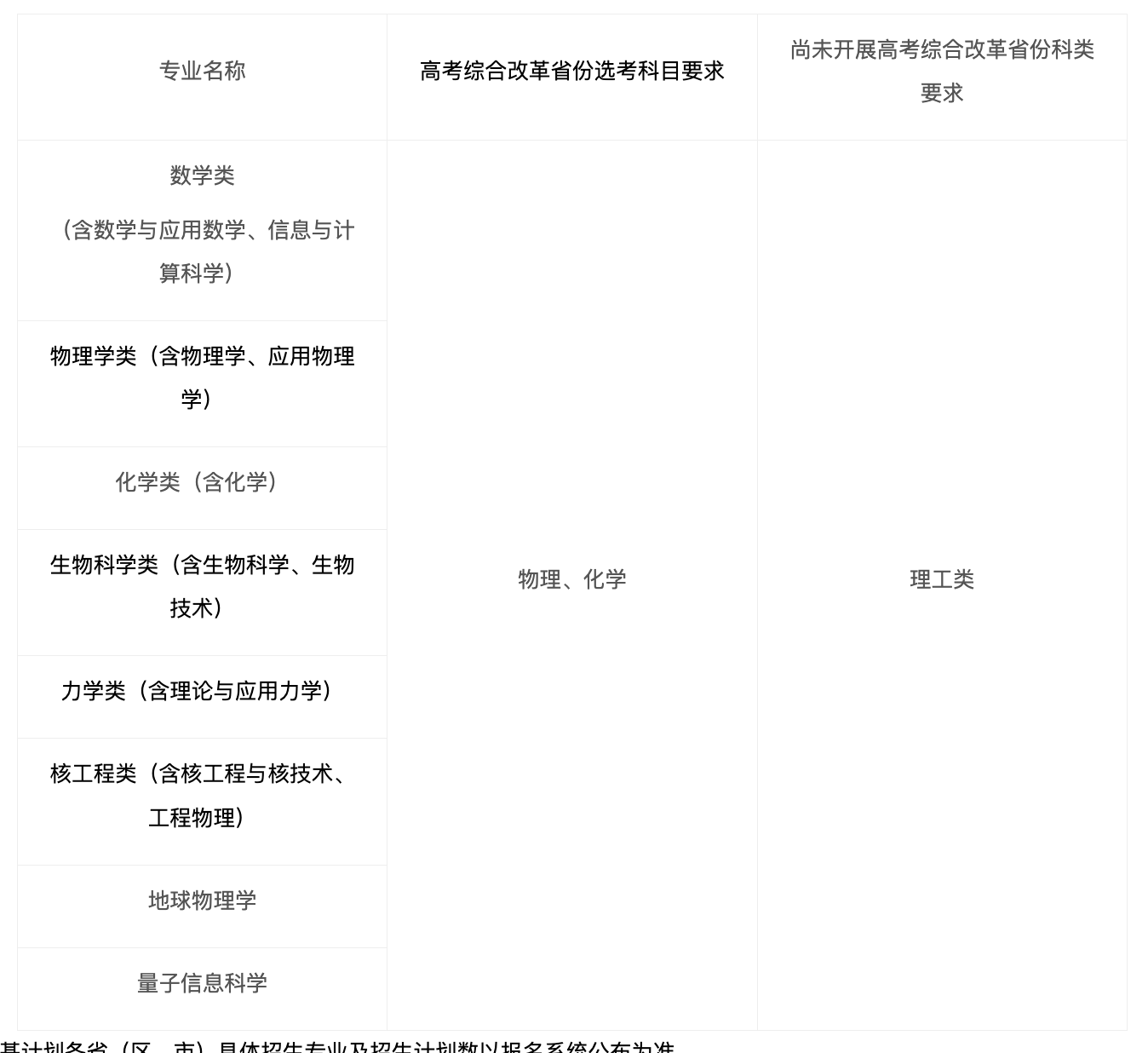 (一)我校2025年强基计划招生专业包括:数学类(含数学与应用数学、信息与计算科学)、物理学类(含物理学、应用物理学)、化学类(含化学)、生物科学类(含生物科学、生物技术)、力学类(含理论与应用力学)、核工程类(含核工程与核技术、工程物理)、地球物理学、量子信息科学。