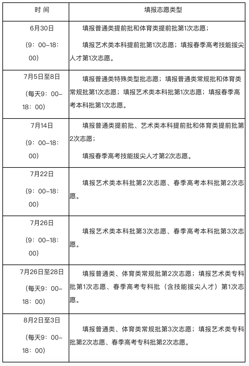 答:考生须按规定时间填报志愿,各批次志愿填报时间均为每天的9:00-18:00。