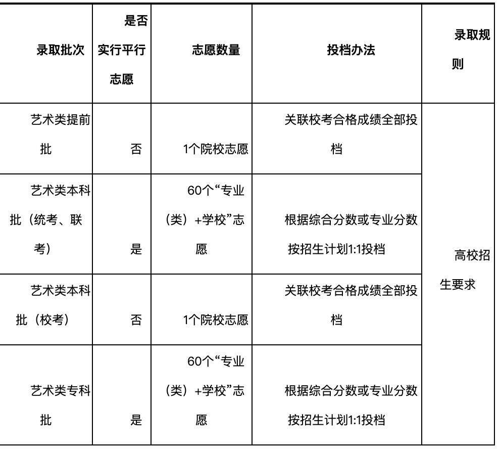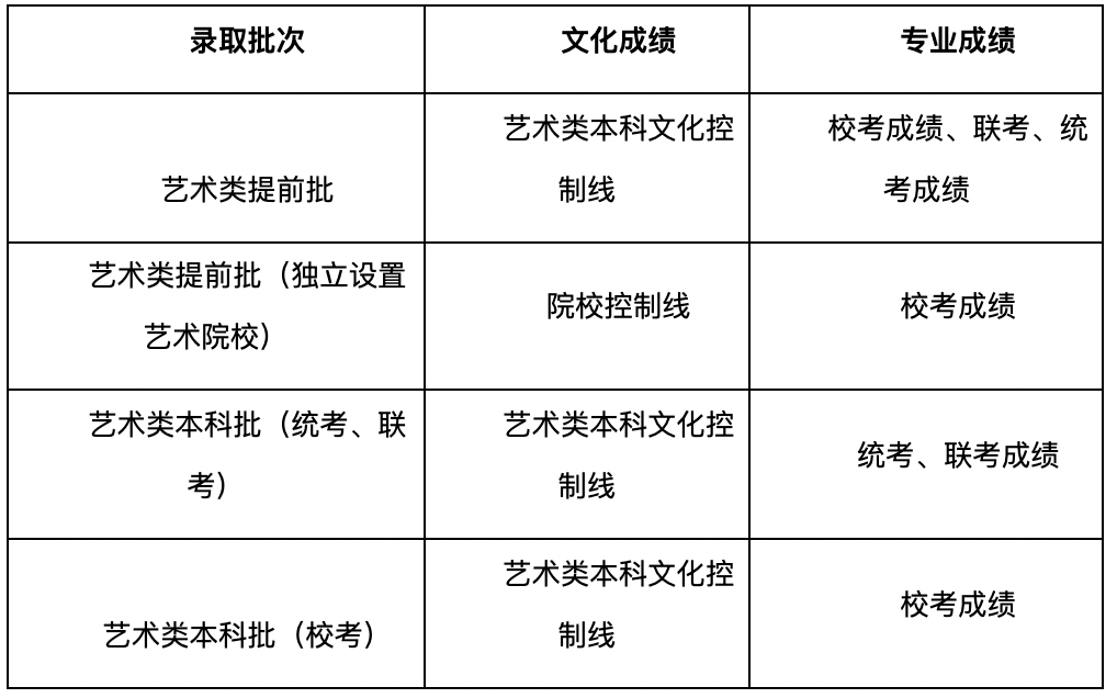 答:艺术类分为本科提前批、本科批、专科批三个录取批次,录取工作按三个批次依次进行。