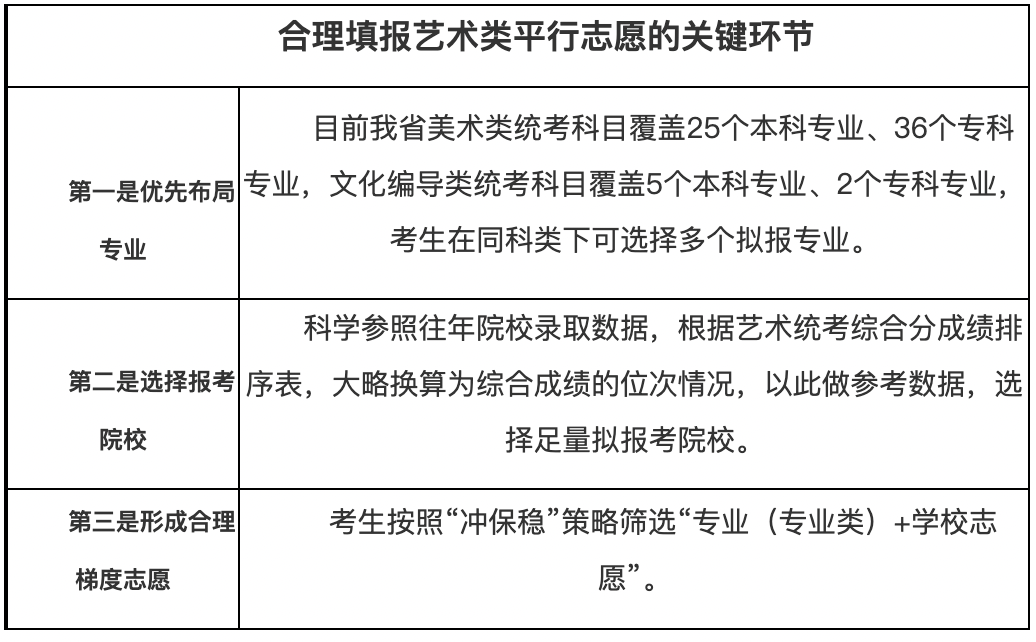 第三步,选择报考院校及专业。一要按照录取批次合理填报院校志愿。建议考生根据自己的艺术专业成绩情况,按照提前院校报考、平行志愿院校报考、自身专业校考成绩(综合成绩)占位靠前的院校报考。二要认真选报专业。我省美术类、文学编导类、舞蹈类、书法类统考科目下所覆盖的招生专业数量多,考生在认可统考成绩的院校中,根据自身特长和优势,分录取批次合理选择报考的专业志愿。批次报考顺序建议:提前批招生院校、艺术类本科批院校。艺术类本科批平行志愿填报时,按照招生院校、招生专业、招生计划、参照往年录取数据,分梯度降序安排志愿顺序。