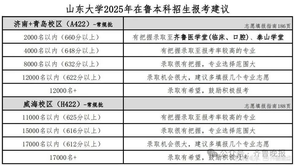 山东大学公布了2025年在山东本科报考建议。如果你是山东考生,想报考招生代码为H422.济南和青岛校区在常规批录取的专业,那么,1.2万名以内录取机会很大。