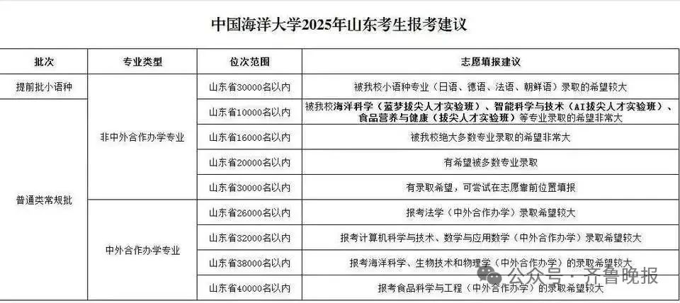 报考中国海洋大学非中外合作办学专业,全省1万名以内,被海洋科学(蓝梦拔尖人才实验班)、智能科学与技术(AI拔尖人才实验班)、食品营养与健康(拔尖人才实验班)等专业录取希望非常大。全省3万名以内有录取希望,可尝试在志愿靠前位置填报。详情一起来了解: