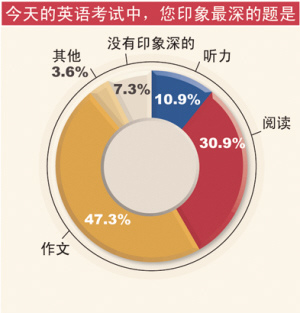 而对于英语考试中印象最深的题,47.3%的被访问考生不约而同地选择了作文。“2010年的英语作文是一个看图作文,所以印象蛮深的。”第十中学考场的一位男性考生说道。(来源:东方早报)