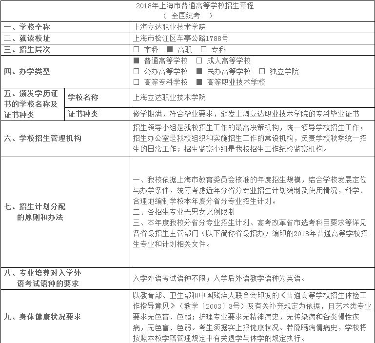 2018年上海立达职业技术学院招生章程