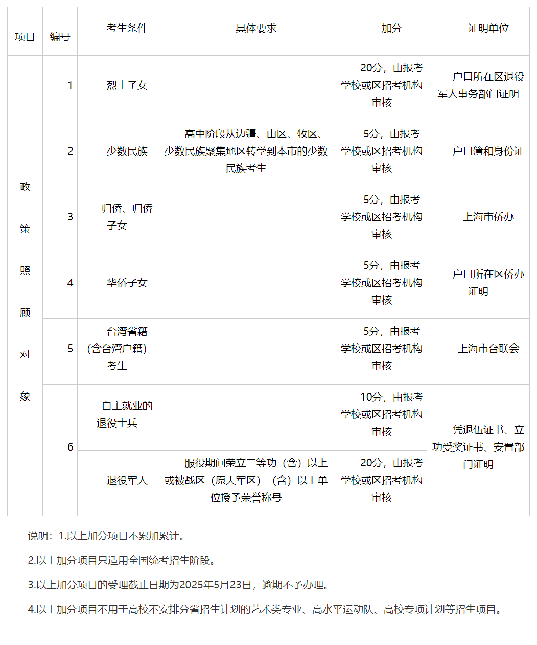 2025年上海市普通高等学校秋季统一考试招生工作办法已发布,加分政策详细如下: