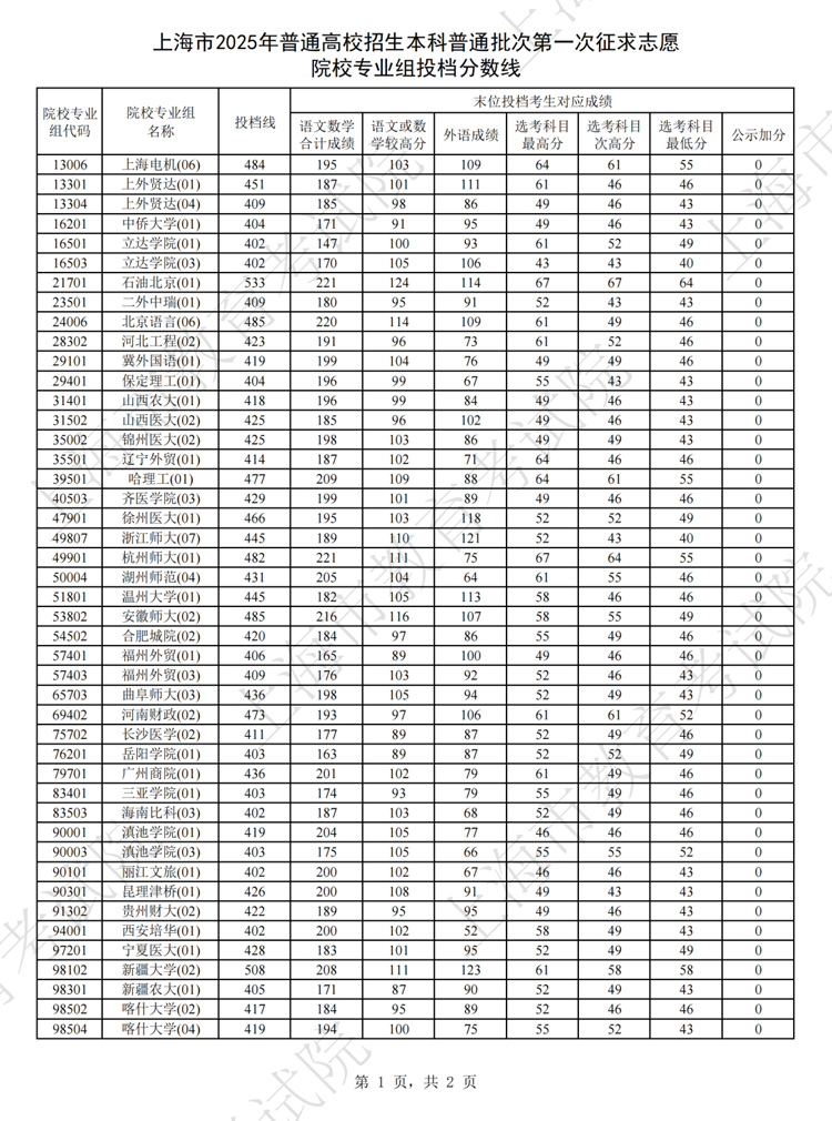 上海2025年本科普通批次第一次征求志愿院校专业组投档分数线公布