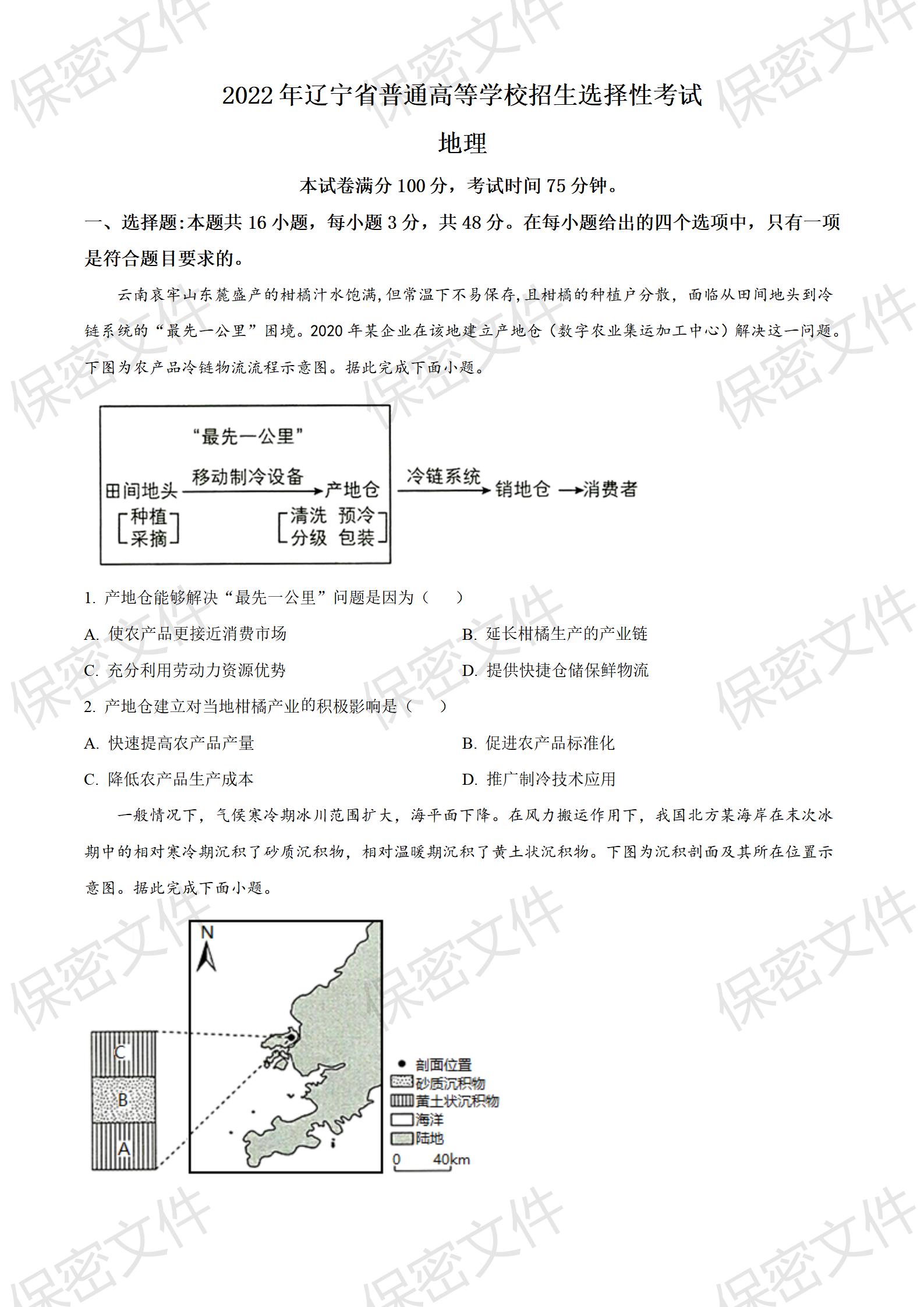 2022年辽宁高考地理真题word版原卷(免费下载)
