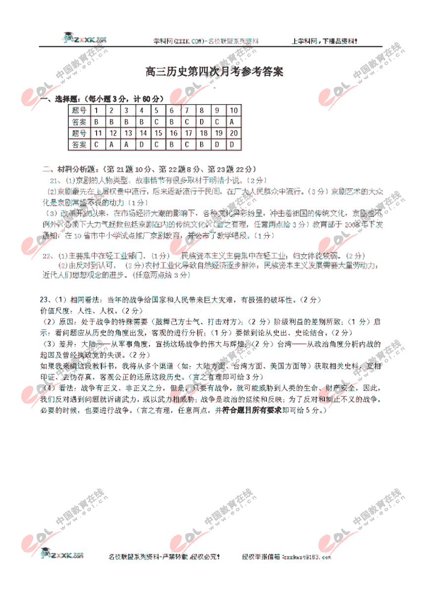 山西大学附中2011届高三第四次月考历史试题