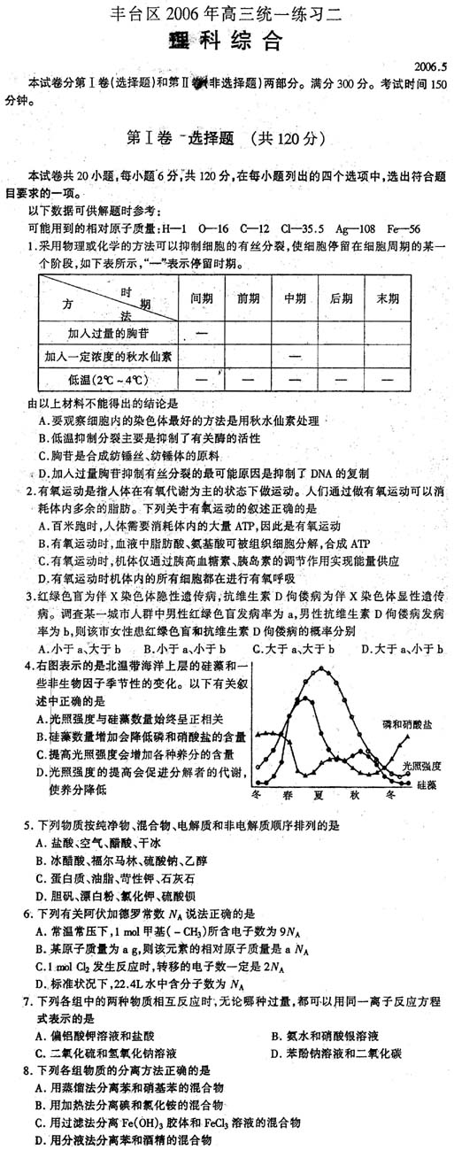 丰台区2006年高三统一练习 理科综合
