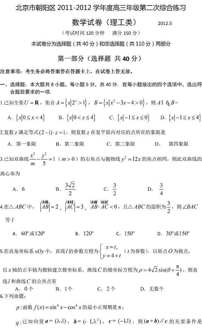 2012朝阳二模数学理科试题及答案