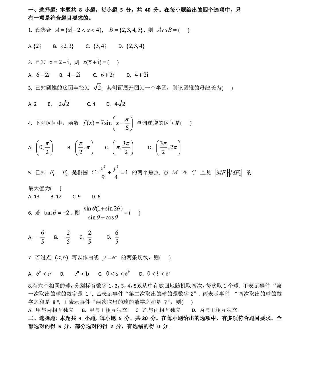 2021年新高考Ⅰ卷数学试题
