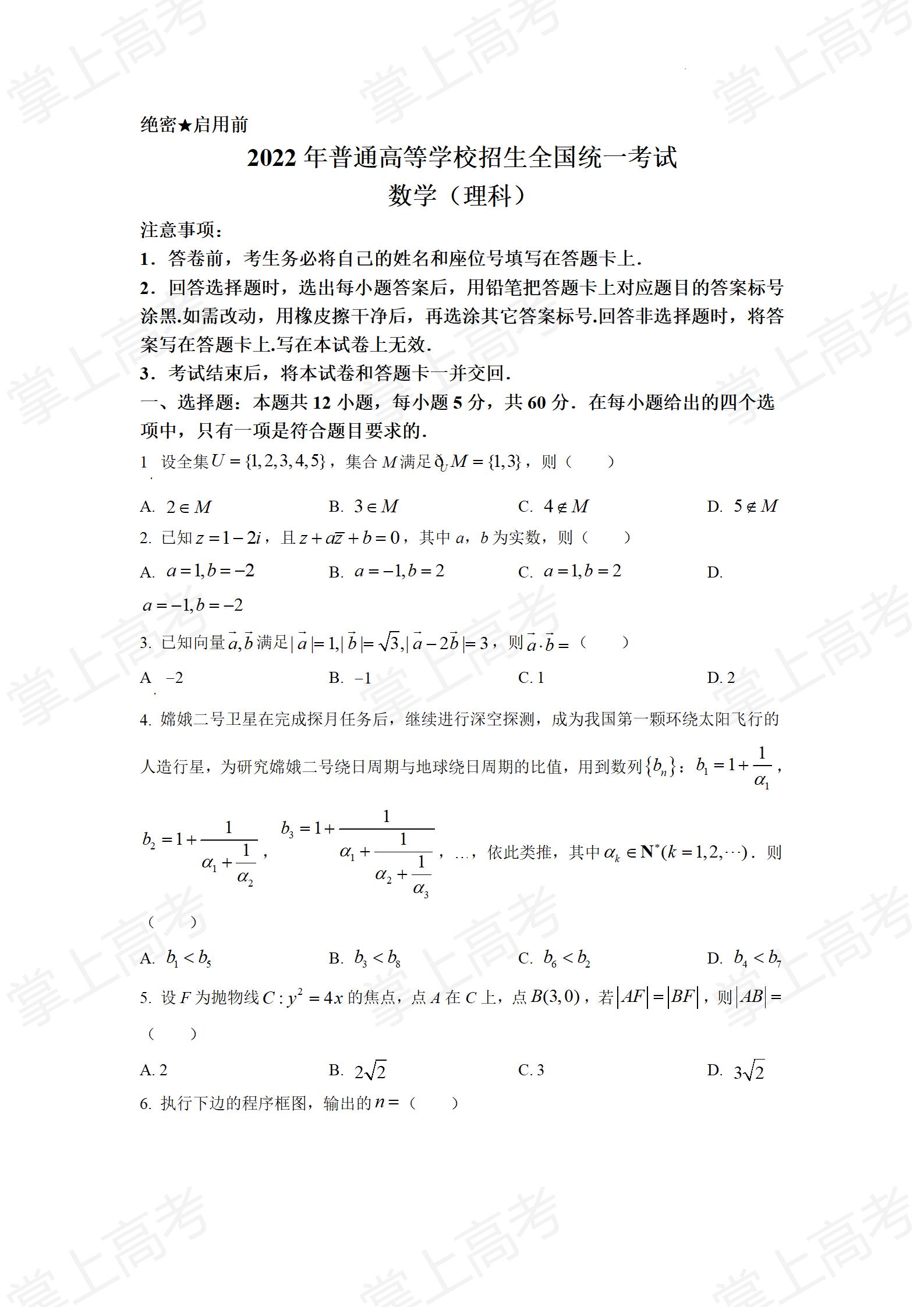 2022年全国乙卷数学(理科)高考真题word版原卷(免费下载)