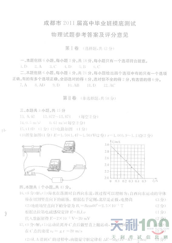 四川成都市2011届高三班摸底测试:物理