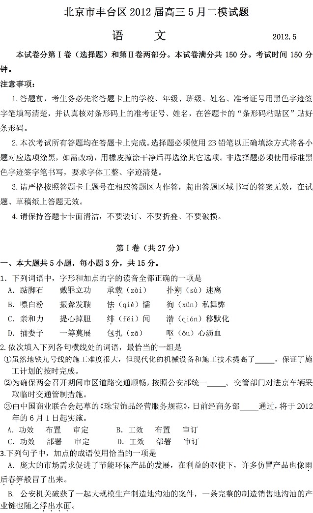 2012丰台二模语文试题及答案