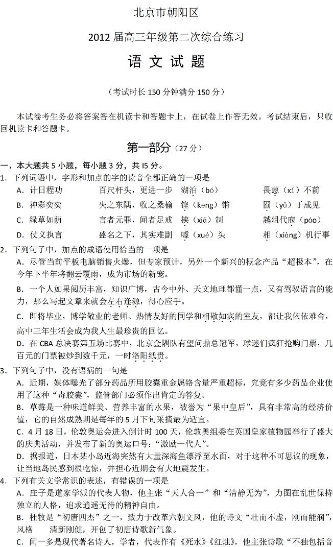 中国教育在线讯 2012朝阳二模于5月初进行,此次考试乃2012高考前的一次重要演练,考题由市知名专家结合了2012高考大纲(考试说明)并依托最新时事为背景出的,高考模拟意义重大。