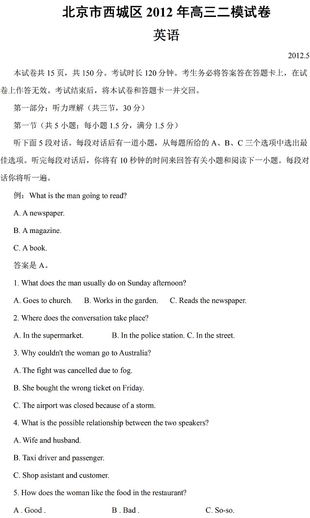 中国教育在线讯 2012西城二模于5月初进行,此次考试乃2012高考前的一次重要演练,考题由市知名专家结合了2012高考大纲(考试说明)并依托最新时事为背景出的,高考模拟意义重大。