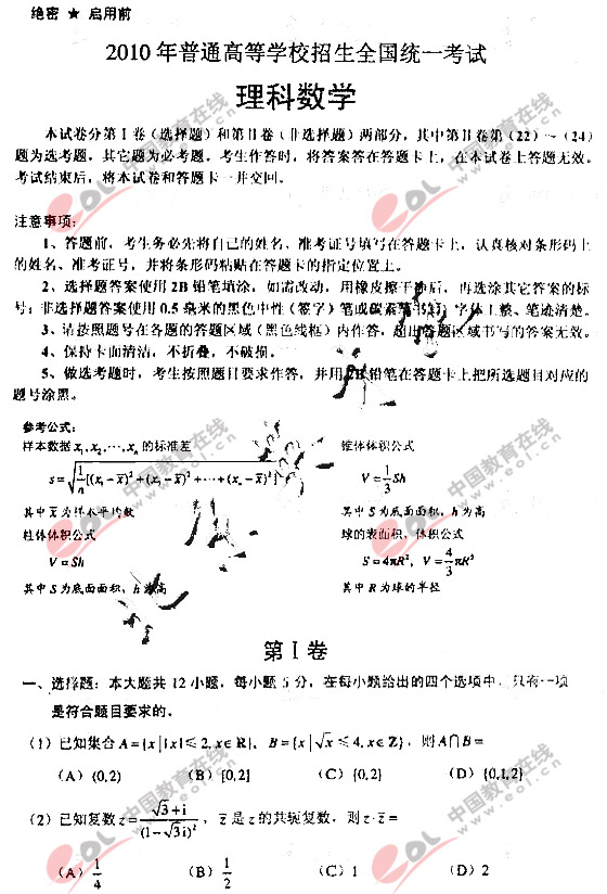 2010年高校招生统一考试理数及答案(全国新课标)