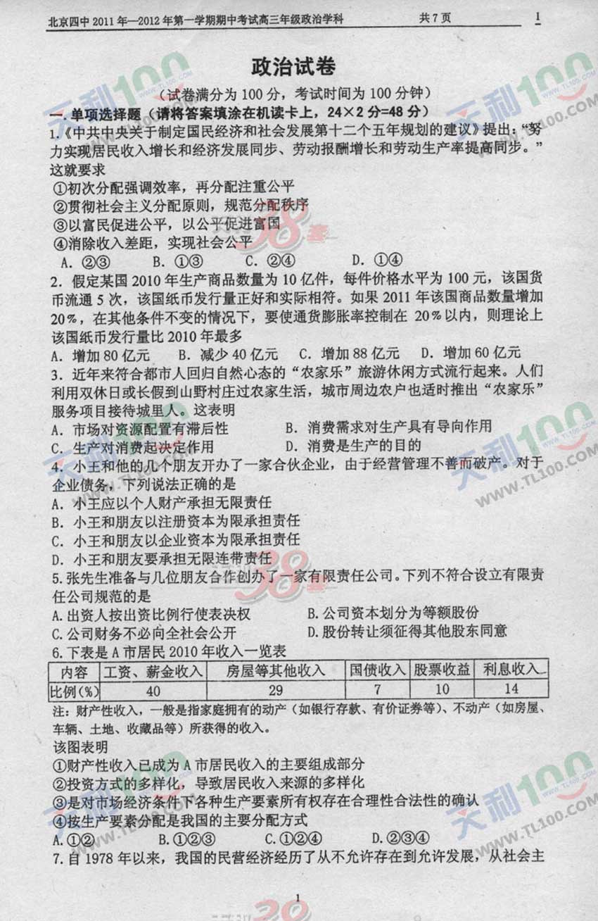 2012北京四中期中政治试题及答案