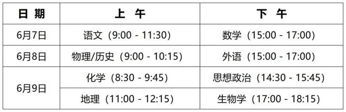 全省高考于6月7日—9日统一进行。各科目考试时间(北京时间)安排如下: