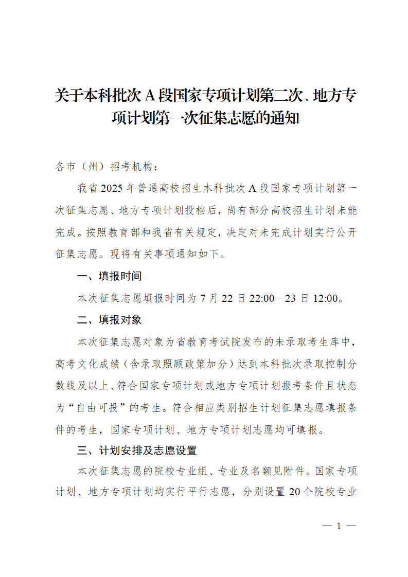四川省关于本科批次A段国家专项计划第二次、地方专项计划第一次征集志愿的通知已发布,具体内容如下: