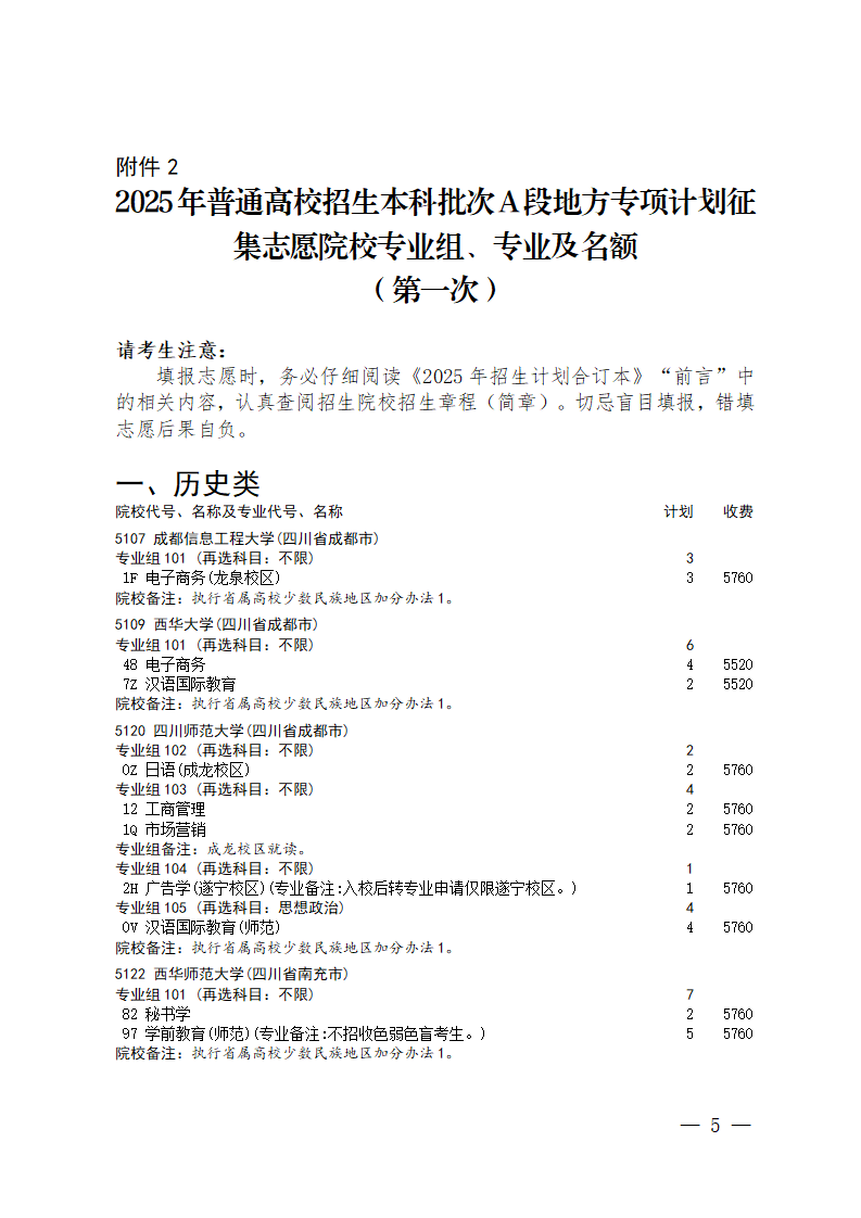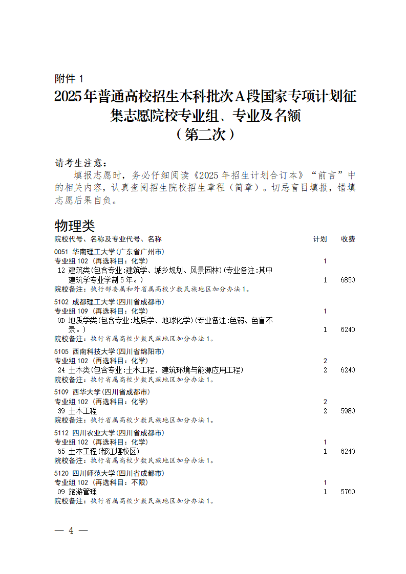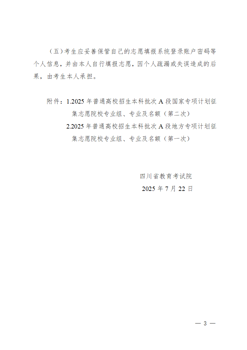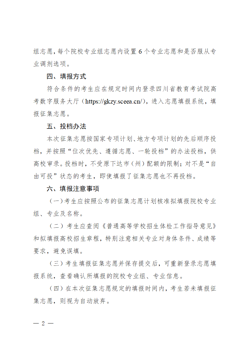 四川省本科批次A段国家专项计划第二次、地方专项计划第一次征集志愿的通知