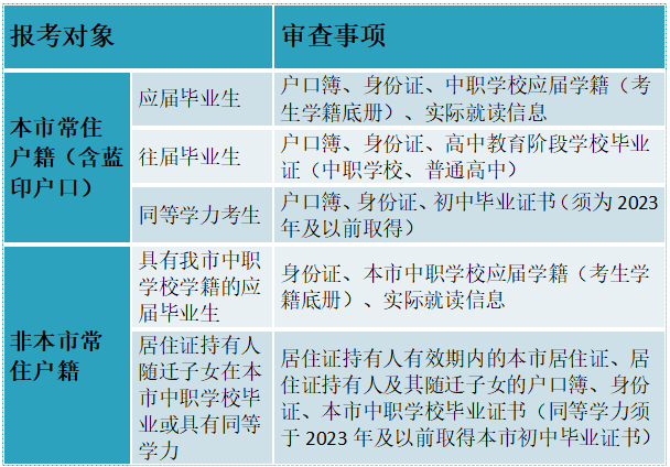 (2)具有本市常住户籍的普通中专、职业高中、技工学校(以下简称“中职学校”)毕业生、普通高中往届毕业生、同等学力考生;具有本市中职学校正式学籍的应届毕业生;在本市中职学校毕业或具有同等学力的本市居住证持有人随迁子女。