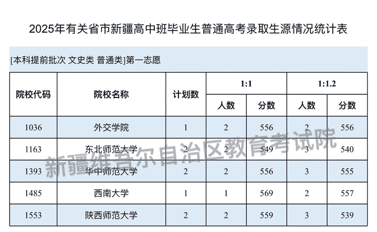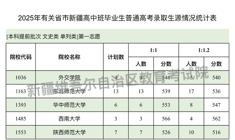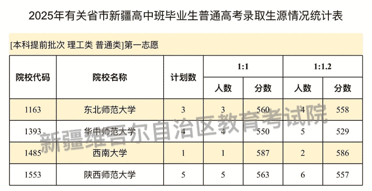 按照录取工作安排,2025年有关省市新疆高中班毕业生普通高考招生本科提前批次投档录取工作于7月19日开始,新疆教育考试院根据投档原则进行了投档,现将部分院校生源情况公布如下: