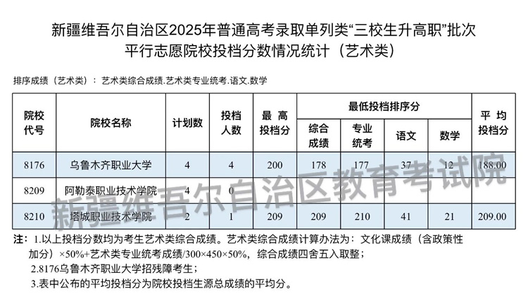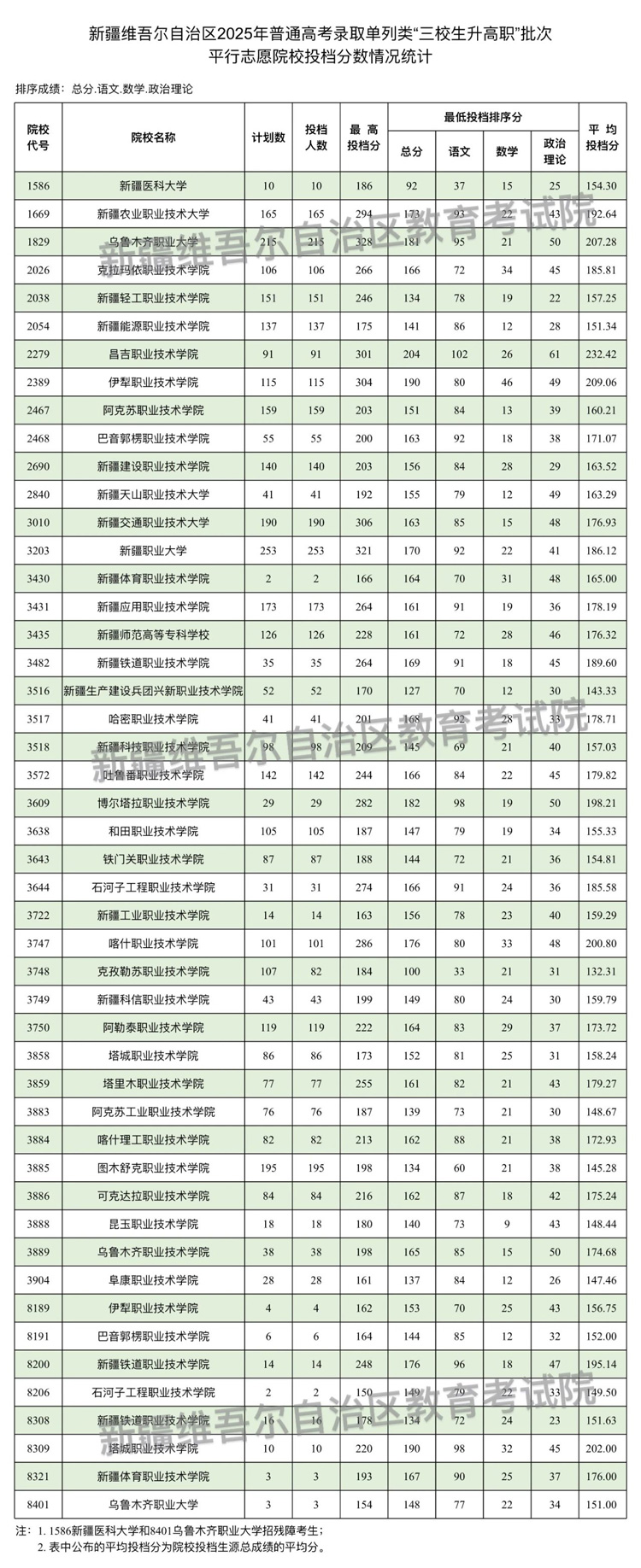 新疆维吾尔自治区2025年普通高校招生单列类“三校生升高职”批次投档情况