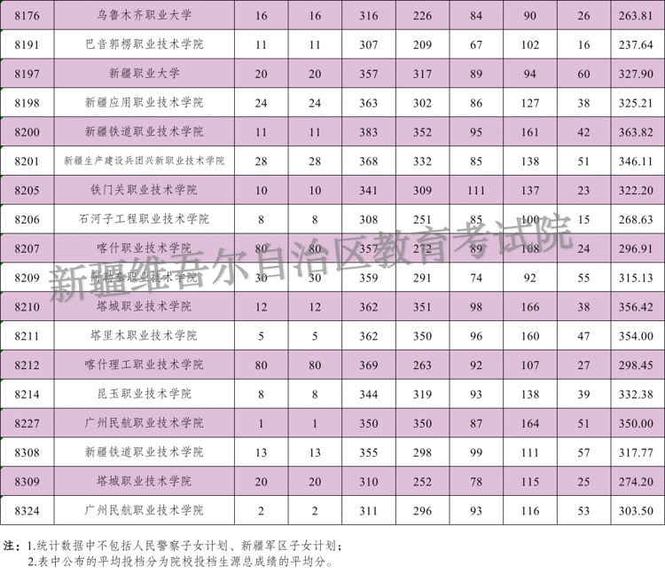 按照录取工作安排,新疆维吾尔自治区普通高校招生普通类高职(专科)批次投档录取工作于8月17日正式开始。新疆教育考试院根据投档原则向普通类高职(专科)批次在我区招生的院校进行了投档,现将相关院校投档情况公布如下: