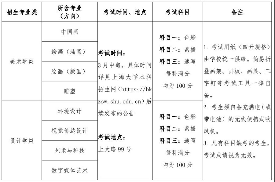 美术学类【中国画、绘画(油画)、绘画(版画)、雕塑】、设计学类【环境设计、视觉传达设计、艺术与科技、数字媒体艺术】专业投档至上海大学的考生: