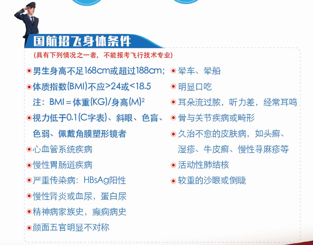 身高168厘米—188厘米;体重符合民航招收空勤学生体重指数标准。裸眼视力不低于0.1;近视屈光度不超过450度,远视屈光度不超过300度,屈光参差不大于250度,散光不超过200度;18周岁前不可做角膜屈光手术(术后6个月方可参加体检);佩戴角膜塑形镜者在塑形效果消失后方可参加体检。