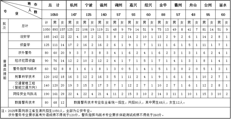 2025年,浙江警察学院面向浙江籍生源招生计划为1050人,分全省统招计划和分市招生计划。实施全省统招计划的专业为数据警务技术,实施分市招生计划的专业为治安学、侦查学、涉外警务、经济犯罪侦查、警务指挥与战术、刑事科学技术、交通管理工程(智能交通方向)、网络安全与执法。招生计划详见《浙江警察学院2025年浙江省分专业招生生源计划》(附件1)。