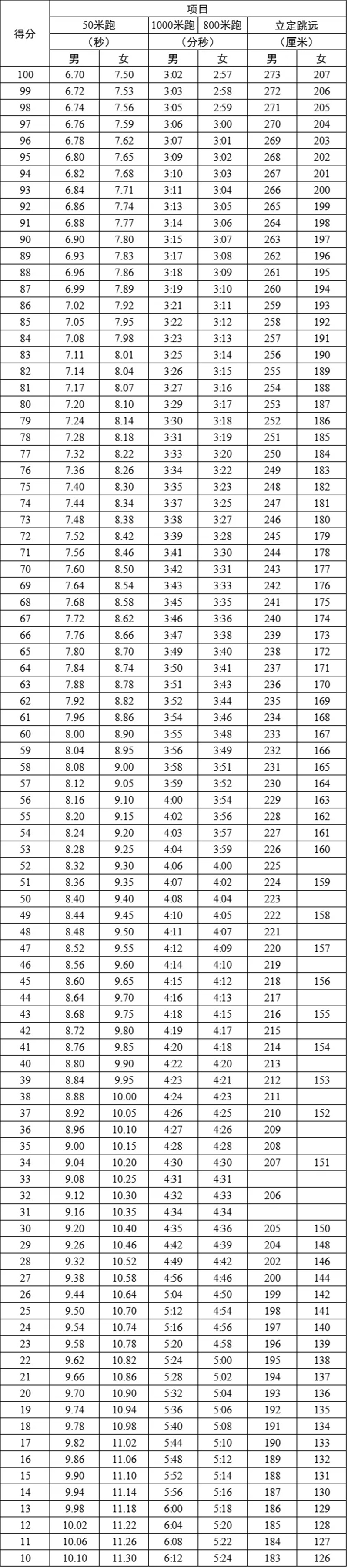体能测试成绩为50米跑、立定跳远、1000米跑(男)/800米跑(女)三项成绩之和。单项满分为100分,成绩总分300分。相关要求和评分标准详见《浙江警察学院体能测试要求和评分标准》(附件3)。