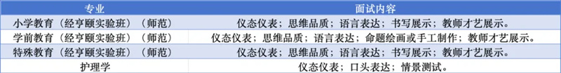 第十六条 资格审查学校组织专家组对考生报名材料进行审核,确定参加综合素质测试的考生名单。按照学业水平考试折算总成绩从高到低排序。小学教育(经亨颐实验班)(师范)、学前教育(经亨颐实验班)(师范)和特殊教育(经亨颐实验班)(师范)专业以专业计划数10倍的比例确定获得面试资格的名单(同分考生一并划入);护理学专业以专业计划数8倍的比例确定获得面试资格的名单(同分考生一并划入)。符合报考条件的报名人数中,小学教育(经亨颐实验班)(师范)、学前教育(经亨颐实验班)(师范)和特殊教育(经亨颐实验班)(师范)专业未超过计划数10倍,护理学专业未超过计划数8倍,则直接进入面试。