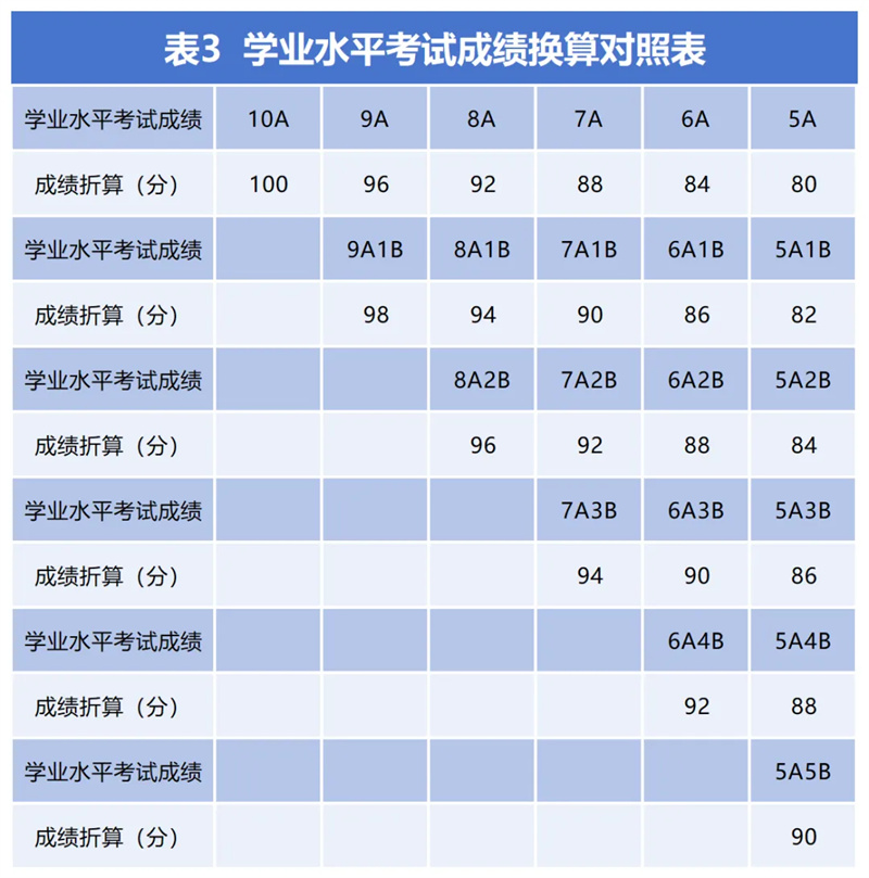 第二十一条 对进档考生,按综合成绩从高分到低分进行排序。综合成绩按“学业水平考试成绩(折算成满分100分)×20%+综合素质测试成绩(折算成满分100分)×20%+高考总分(折算成满分100分)×60%”计算形成。若考生综合成绩相同时,则按单项顺序及分数高低排序,单项顺序排列依次为:综合素质测试成绩、高考总分(同分则按照高考位次号排序)、学业水平考试成绩。其中,学业水平考试成绩换算见附表,高中阶段具备相关选修课程学分或相关选修课程成绩优良的,在同等条件下优先录取。新高考改革前的往届生技术科目学业水平考试等第按考生的信息技术、通用技术科目中等第高的计入。