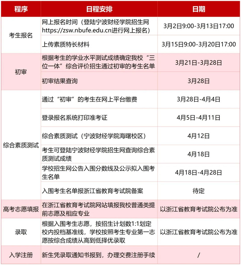 1.网上报名:2025年3月2日9:00—3月13日17:00,申请人进入宁波财经学院招生网,登录“2025年‘三位一体’综合评价招生报名系统”,完成报名手续,每名考生限报1个专业。
