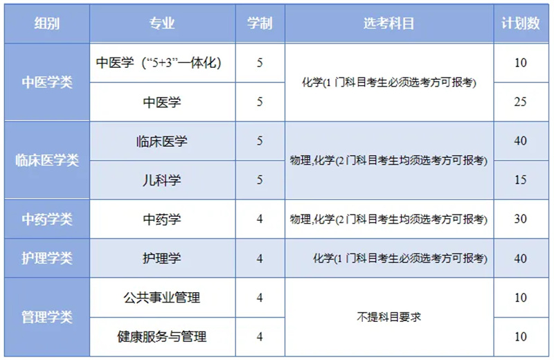 第十三条 2025年三位一体综合评价招生工作面向浙江省招生,总计划数180名。学校将招生专业分为中医学类、临床医学类、护理学类、中药学类和管理学类5个组别。考生只能选报其中1个组别,不能兼报。具体报考专业组别、包含专业、计划数及报考相关专业所需的选考科目要求如下表: