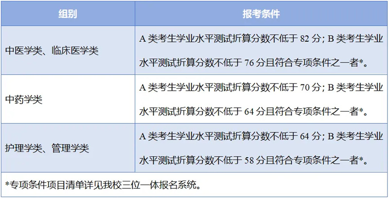 学考折算成绩97分及以上报考中医学类、临床医学类,85分及以上报考中药学类、护理学类、管理学类考生和经审核符合报考条件的B类考生,优先直接获得我校三位一体综合测试资格,不占通过材料评审的人数比例。