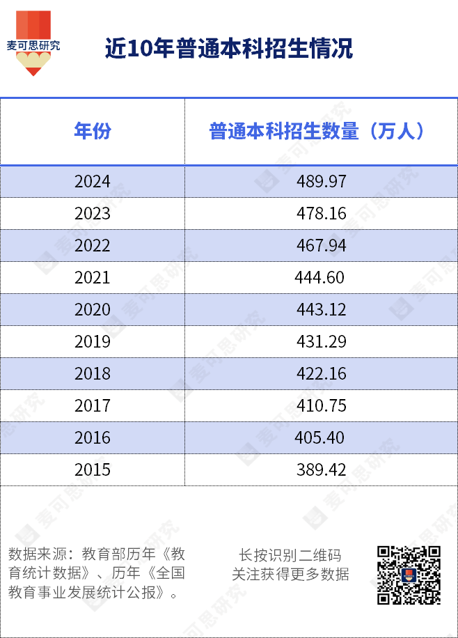 我国高等教育大众化的核心体现,莫过于本科招生规模的持续稳步攀升。教育部官方数据显示,2015至2024十年间,全国本科招生数从389.42万人增长至489.97万人,累计增幅超100万人,彰显高等教育普及化成果。