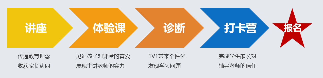 解决了“谁来教”,接下来就是“谁来学”的问题。招生一直是教培机构头疼的问题,尤其是双师这种当地完全陌生的授课形式,到底能招来多少学生,在爱数学正式启动之前陈校长心里也完全没有底。不过陈校长也是“有备而来”,在参加未来魔法校组织的伴跑训练营的过程中,陈校长掌握了好未来学而思的“招生三板斧”,并结合自己对当地学生家长特点的了解,探索出了讲座、体验课、诊断、打卡营“四步走”的招生流程:通过未来魔法校针对家长的教育理念宣讲收获家长认同;承接强互动的双师体验公开课让家长见证孩子对于双师课堂的喜爱,建立对一线主讲老师教学实力的钦佩;紧跟对体验课学生的一对一诊断个性化的发现学习问题;最后用打卡营完成学生家长对辅导老师的信任,实现最终的招生转化。